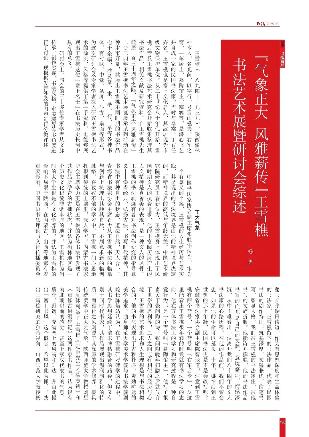 ·2025年第3期,杨勇《“气象正大 风雅薪传”王雪樵书法艺术展暨研讨会综述》