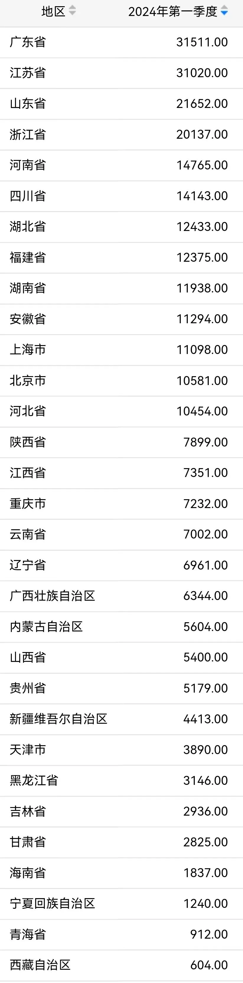 31省区市2024年一季度GDP总量(单位:亿元)。来自国家统计局网站。