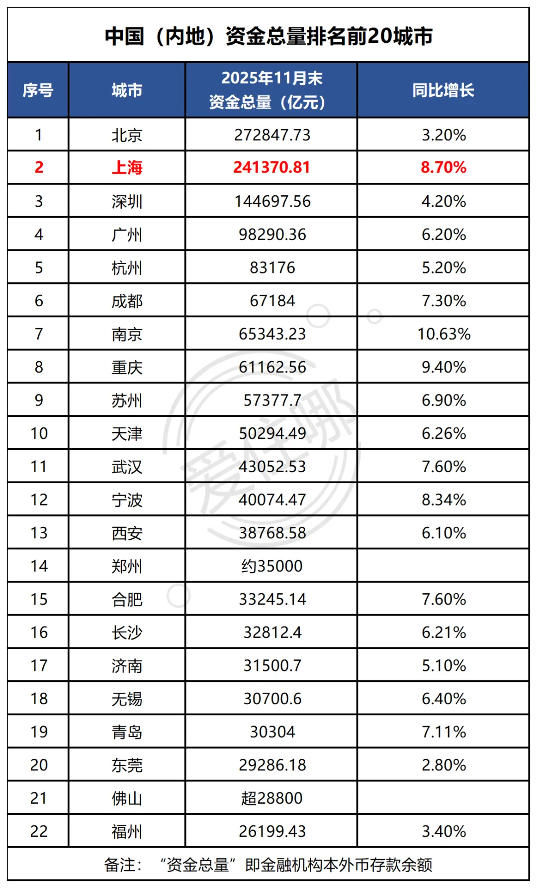 年终岁末,复盘城市“钱袋子”流向是洞察其活力的关键。2025年中国城市资金版图,既有头部稳局,也有新势力亮点。央行本外币存款数据(可信度高、覆盖全面)是核心依据,下面就来看看头部城市的资金格局。