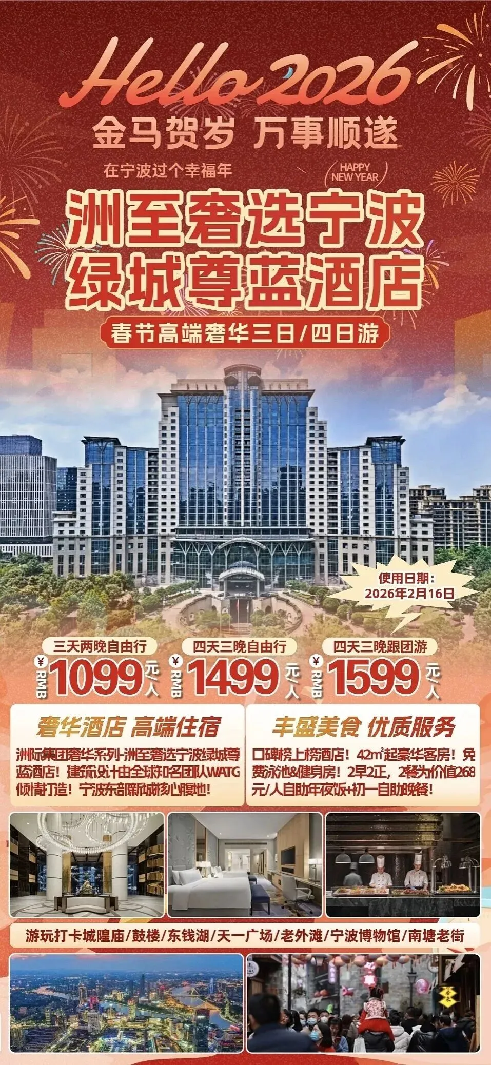 12:00上海博物馆南门出发前往宁波,抵达后办理入住,自由活动。17:30左右享用酒店内268元/人自助年夜饭。Day2:宁波 宿:洲至奢选宁波绿城尊蓝酒店 餐:早餐、晚餐(268元/人自助年夜饭)早餐后,推荐游览【天一广场】,这座镶嵌于甬城三江口核心的璀璨明珠,自2002年落成以来,便以 "城市客厅" 之姿,将商业文明与历史文脉交织成一幅波澜壮阔的画卷。作为宁波 "中提升" 战略的标志性工程,它东起车轿街,西至开明街,北沿中山东路,南临药行街,总占地面积19.6公顷,总建筑面积达22万平方米,宛如一艘巨型商业航母,承载着城市发展的澎湃动力。Day3:宁波 宿:洲至奢选宁波绿城尊蓝酒店 餐:早餐早餐后,推荐游览【东钱湖】,东钱湖位于浙江宁波,是浙江省最大的天然淡水湖,面积约22平方公里,素有“西子风韵、太湖气魄”之美誉。其历史可追溯至唐代,曾是浙东水利枢纽,宋代范仲淹曾在此治湖。湖光山色相映,周边有小普陀、陶公岛等景点,四时风光各异,春赏桃柳、夏观荷花、秋品红枫、冬览雪霁。推荐前往【老外滩】,宁波老外滩于1992年作为商业旅游项目开发,已成为宁波的著名景观。老外滩融东西方建筑文化之美,以新兴的BlockS商业街区概念集中打造一个集购物、美食、娱乐、旅游、居住为一体的特色区域,塑造宁波城市时尚地标。早餐后推荐前往【宁波博物馆】,是宁波市的文化地标之一。由首位中国籍普利兹克建筑奖得主王澍设计,以“新乡土主义”风格著称。是国家一级博物馆和4A级景区,还因网剧《三体》取景成为网红打卡地。馆藏文物逾6万件,包括唐代越窑青瓷、南宋金银器等,其中国家一级文物“唐越窑荷花盏托”釉色莹润,造型如荷绽叶展,尤为珍贵。推荐前往【南塘老街】,位于宁波古城南门外,曾经是旧宁波商贸文化聚集地的“南门三市”,位列宁波八大历史街区之一。老街完整保留500多米的江南传统街巷,并在设计建设中成功将老街的历史神韵、建筑特色以及名人文化融入街区布局,再现百年来宁波人经商交易、日常生活的浓厚风气。自费午餐后适时返回上海!费用包含: