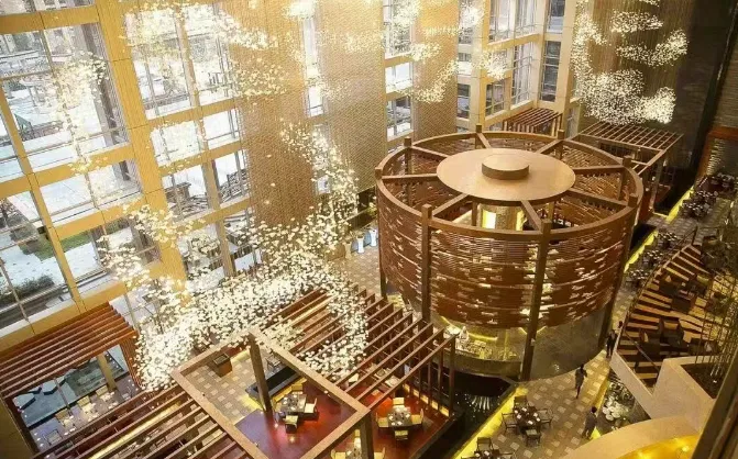 云顶吊灯和21米缓缓滑落的水幕墙,优雅浪漫的云顶吊灯为宾客营造一个通透舒适的用餐环境。