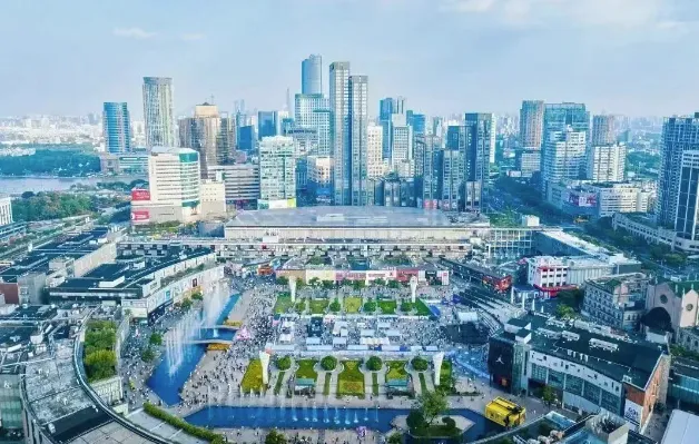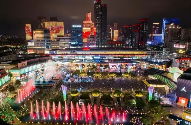 广场由22座欧陆风情建筑群围合而成,中央为3.5万平方米的绿地广场和亚洲第一的音乐喷泉,夜间呈现流光溢彩的视听盛宴。广场西北侧保留有清康熙年间的药皇殿及宋元石雕,古今交融展现历史底蕴。