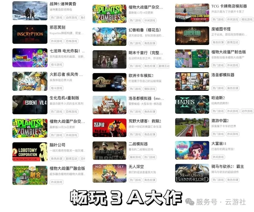本公司是一款专为广大游戏爱好者开发的一款云游戏平台 在云游社你可以玩到各种3A大作 以下⬇️