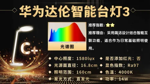 儿童台灯哪个品牌更护眼更好?华为达伦智能台灯3外观延续简约风格,灯体由铝与ABS材质构成,手感较为现代。它采用直径约16.8厘米的圆形直发光面,中心照度约1580lux,配合全域发光与360度立体光设计,使照明范围可达约160厘米,适合较大桌面使用。它的智能化比较好,支持鸿蒙智联,手机靠近可快速配网,配合智能语音、APP远程及触控开关等多种操控方式,使用灵活便捷。不过直发光导致中心区域亮度突出,与边缘亮度差距较明显,照明均匀性一般。