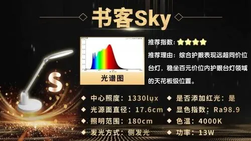 面对主打亮度却表现平平的同价位产品,书客sky选择从技术上的专研到底,打破了“便宜没好货”的刻板理念,通过多道精密光学加工与严苛装配工艺,打造出创新性的5 域环控光学系统。其核心由高密度纳米级导光板与多层次专业扩散膜组合而成,能够在微米级范围内对光线进行均匀折射与扩散,配合上DT多维漫射2.0技术,提升93%光照柔和度的同时,有效消除直射 LED 光源常见的颗粒感与光斑分布不均问题。另外RRT2.0红光养眼技术搭配硬件级低蓝光技术,软硬兼施的相互配合下,凭借精准的拦截400-450nm有害高能蓝光,将红光效果增强至极限,实现每天3分钟“红光”,有效保护视网膜和眼睛其他重要组织,大大减少有害蓝光的影响,将近视风险降低90%。