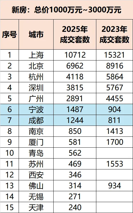 宁波和成都,是豪宅市场的两匹“黑马”。若对比2025年和2023年1千万~3千万元新房成交量,宁波成交量激增64%,成都激增53%,而其他城市都是下跌的。