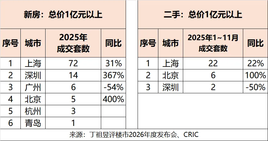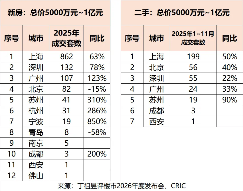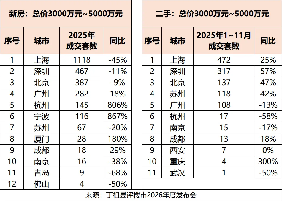 如上所示,2025年总价1000万元~3000万元的新房,成交量最多的五个城市依次是上海、北京、杭州、深圳、广州,均超过2800套。