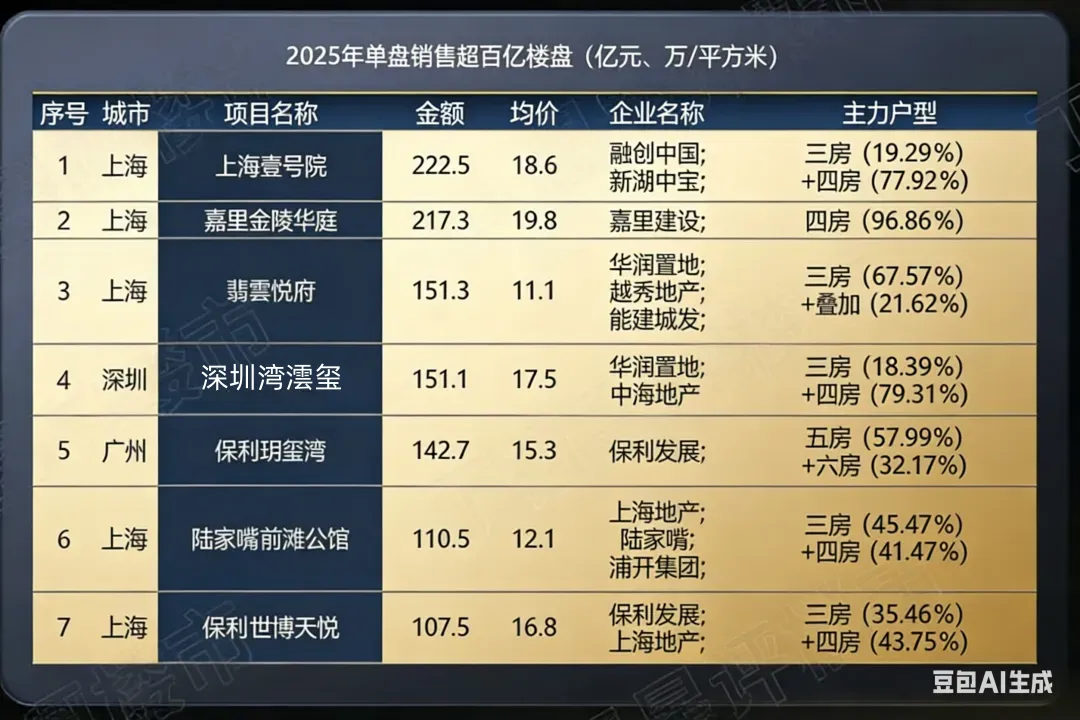 数据来自丁祖昱评楼市2026年度发布会,表格由豆包制作2025年,中国内地的新房市场,共出现了7个“百亿神盘”,其中5个在上海,广州、深圳各有1个。其中,上海还贡献了两个“200亿楼盘”。