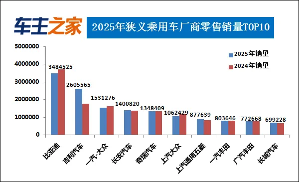 2025年厂商销量前十基本延续了去年排名,仅特斯拉中国跌出前十,长城汽车上榜。其中自主品牌占半壁江山,榜单上增幅最大的是吉利汽车。