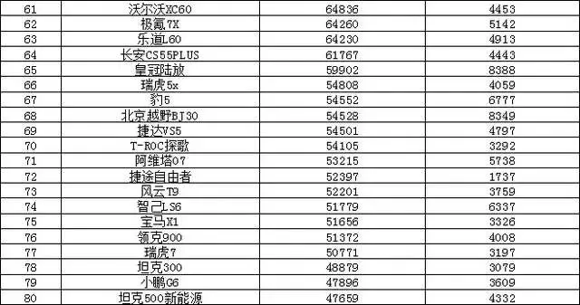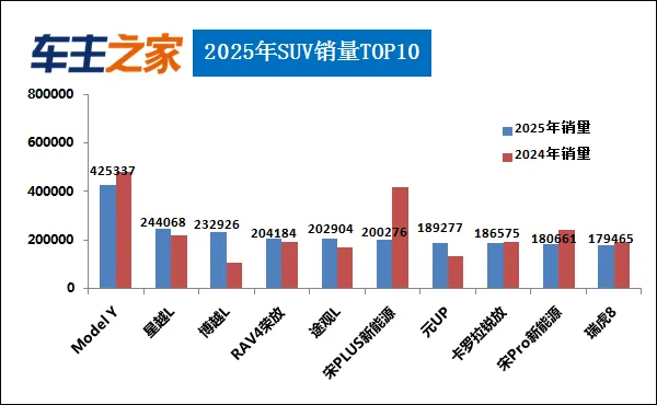 SUV榜前十依旧是些熟悉的面孔。由于家族产品矩阵分走一部分销量,其中宋PLUS新能源(宋PLUS DM-i+宋PLUS EV)销量大幅度下滑,四季度每月销量甚至在万辆以下。吉利旗下星越L和博越L这两款燃油车销量同样拿得出手,博越L在今年升级上市后销量更上一层楼。