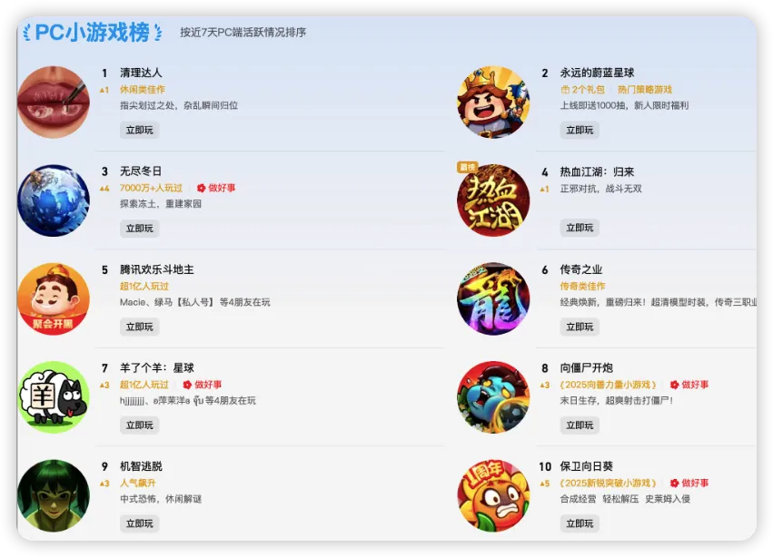 这是微信游戏PC小游戏榜。微信小游戏手机不用下载点开即玩,PC小游戏榜的游戏也是最适合在电脑上玩的微信小游戏。以下图片中是近7天最火的100款手机电脑都能玩的微信小游戏!