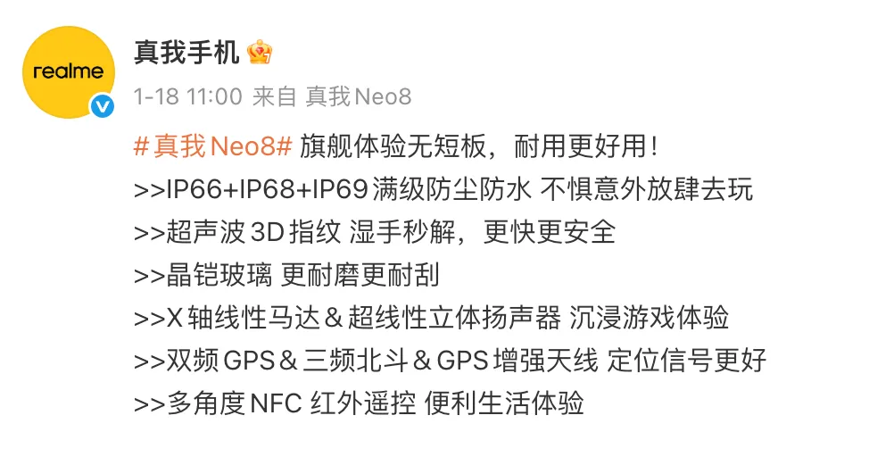 配置这块呢,真我 Neo8 这次也在屏幕、性能、续航、影像等方面迎来全面加强。