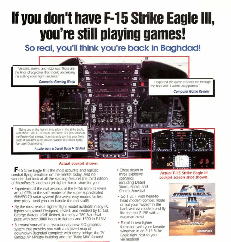 这是《电脑游戏世界》读者的一封完全严肃的来信,描述了他的游戏设备。他买了一个旧的战斗机驾驶舱,在里面安装了两台游戏电脑,还配有一个座舱盖,将他包围在一个受保护的游戏空间里。他甚至在系统里安装了电话和对讲机,这样他的妻子就可以叫他吃饭了。