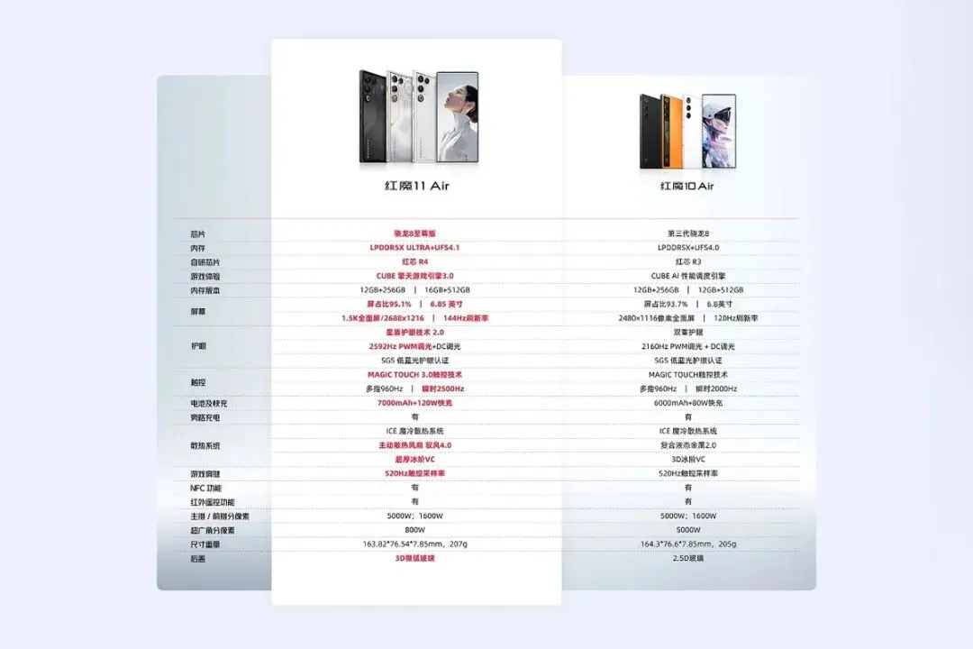 对比来看,其实红魔并不是首次推出Air,也不存在跟风,毕竟去年红魔10 Air就已经上市了。而今年的红魔11 Air得到了全面增强,比如升级了芯片,升级了1.5K屏幕,增大了电池等等,性价比更高。