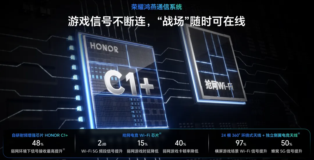 通信网络方面,荣耀WIN搭载了鸿雁通信系统,硬件上使用了24根环绕式天线+独立侧翼电竞天线,使用了抢网电竞WiFi芯片、自研射频增强芯片C1+,弱网环境下信号提升了48%。