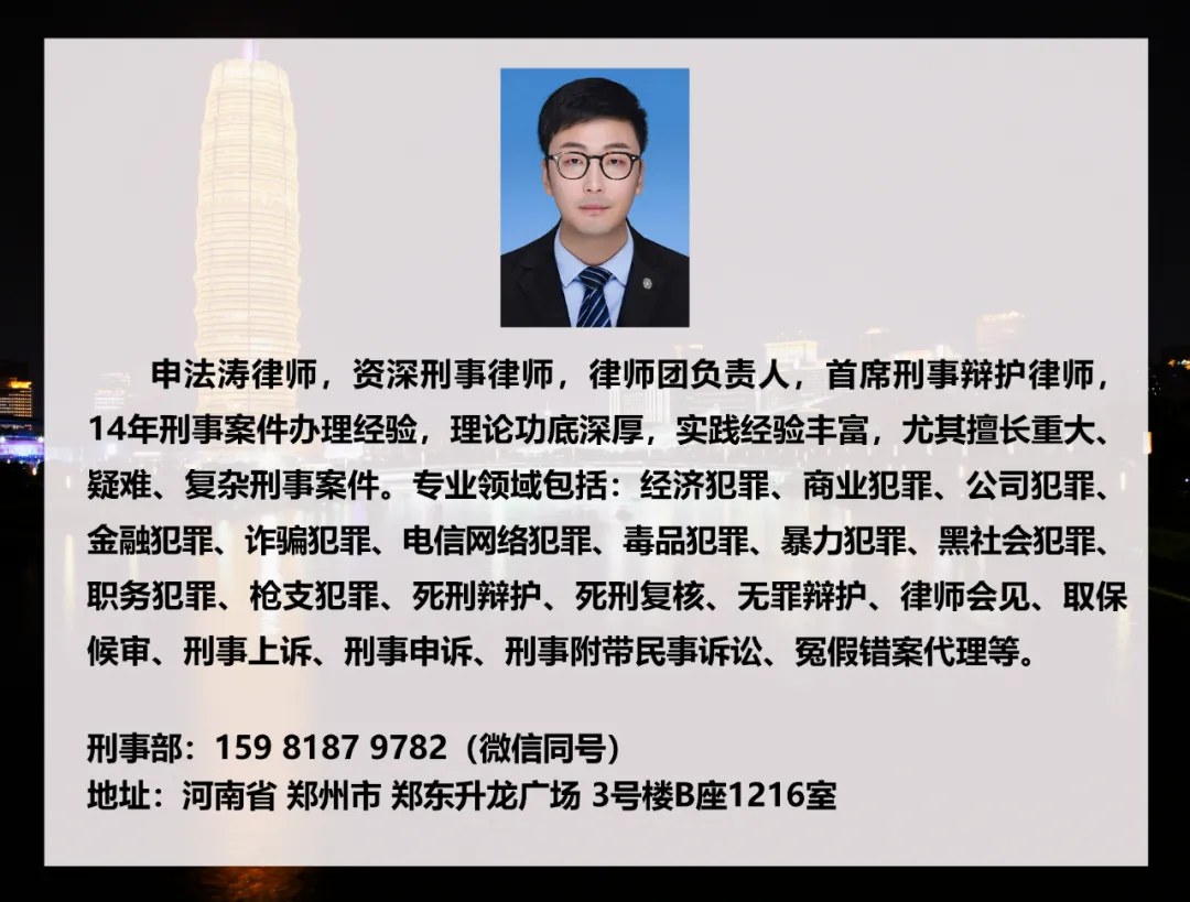 申法涛律师,郑州著名刑事案件辩护律师,律师团负责人,首席刑事辩护律师,14年刑事案件办案经验,理论功底深厚,实践经验丰富,专业办理全国各类重大、疑难、复杂刑事案件。专业领域:经济犯罪、商业犯罪、公司犯罪、金融犯罪、诈骗犯罪、电信网络犯罪、毒品犯罪、暴力犯罪、黑社会犯罪、职务犯罪、枪支犯罪、死刑辩护、死刑复核、无罪辩护、律师会见、取保候审、刑事上诉、刑事申诉、刑事附带民事诉讼、冤假错案代理等。