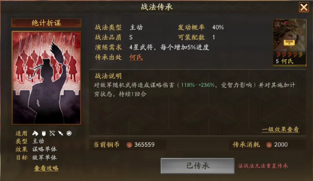 如果您想找人开荒、控号、打野、配将、自走棋,可以添加【秋石小军师的微信:sgzxjs】。我们会尽最大努力帮助您获得更好的游戏体验!更新1:五谋弓携带【绝计折谋】,发动时候对敌军随机武将造成236%的谋略伤害,并施加技穷状态。为谋略队伍提供了一个单点爆破,控制的手段,面对主动战法多的队伍是一个不错的选择,毕竟是免费送的武将。更新1:SP关羽携带【藏器待时】。年度武将SP曹操的传承战法【藏器待时】,第三回合起,自身自带主动战法发动率提升8%(受武力影响,加成后可以达到19%左右)搭配SP法正的提升,武圣,百战,SP关羽发动率可以达到92%,第三回合开始基本一直发动。并且造成伤害有30%概率附带20%破阵(受武力影响),SP关羽轻松打出2-4W的伤害。这对于SP关羽有着极大的提升。更新2:【桃园结义】秋石用法官盾测试了一下,有时候杀敌能上万,有时候只有几百,不是很稳定,还需要在进行一些测试。更新:新增回元装备的使用,相当于一个三军之众,还是蛮不错的。非常适合汉室弓、拒马弓给SP貂婵使用,真是更上一层楼了!一切配将要根据大环境来安排!