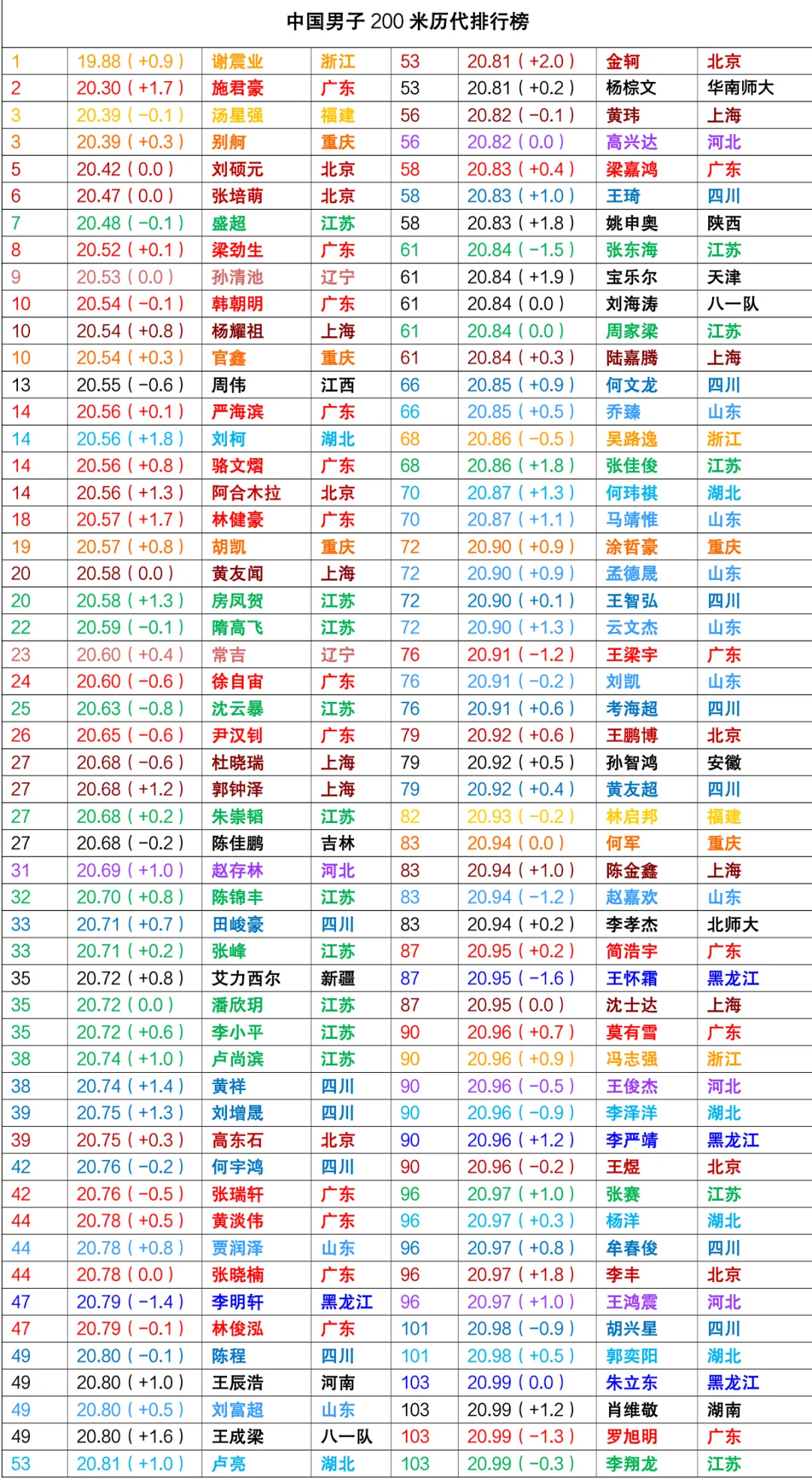 注意:国际田联上广东运动员韩朝明记载成绩为20.42,但一些资料表示实际可能超风速。韩朝明第二好成绩20.54,也许这个成绩算作他的个人最好成绩更科学。(广东另一位运动员黄淡伟情况是一样的,两个人存疑数据属于同一场比赛)