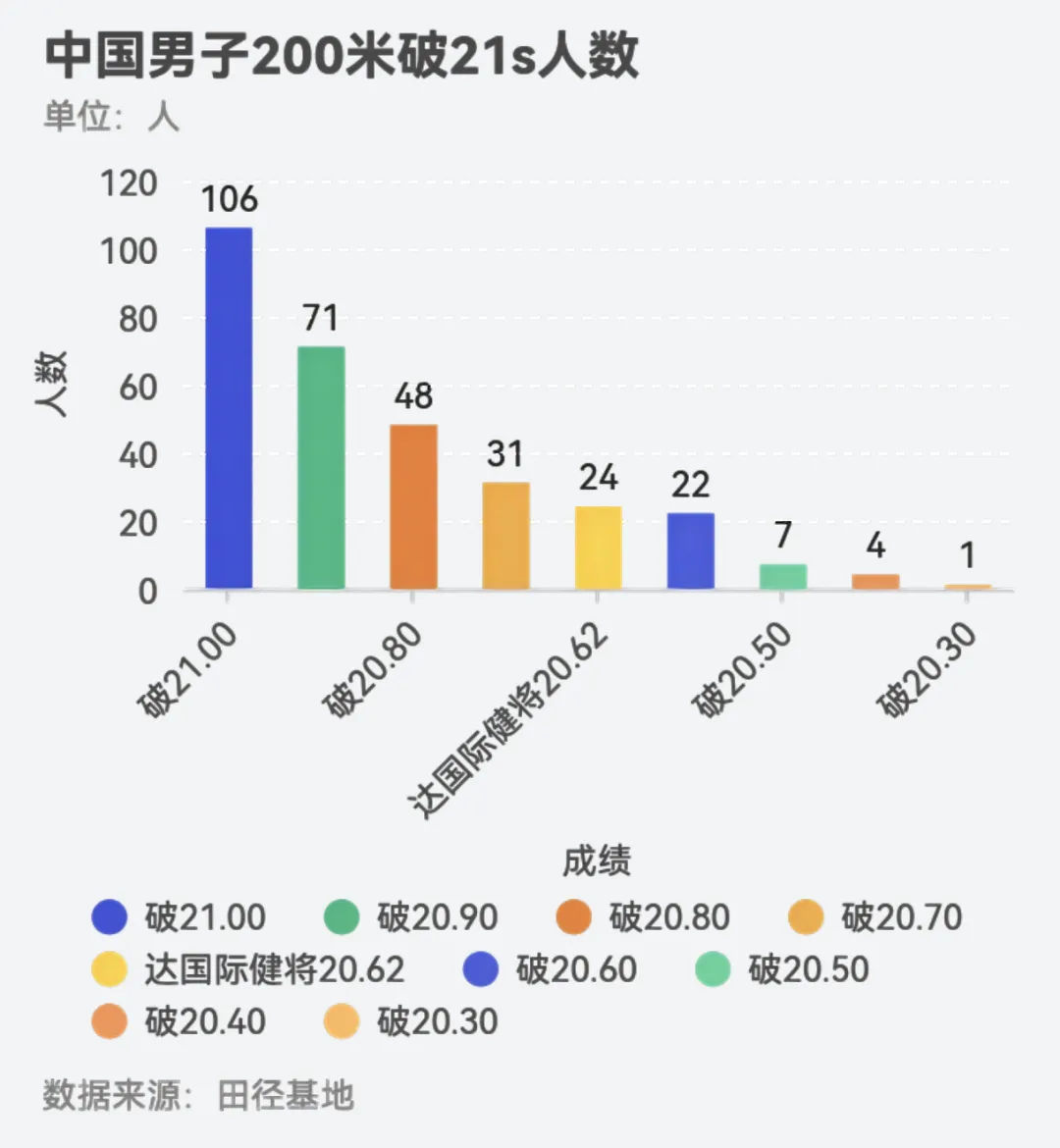破21秒有106人,破20.90有71人,破20.80有48人,破20.70有31人,达到国际健将20.62标准有24人,破20.60有22人,破20.50有7人,破20.40有4人,破20.30共一人