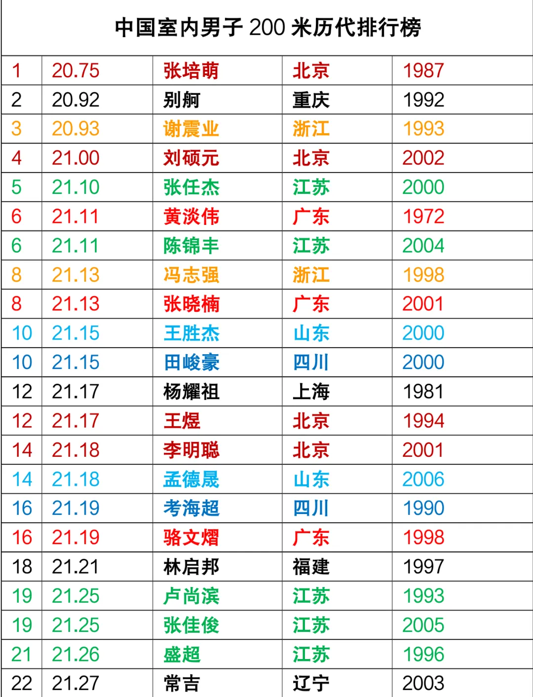 破21的人数越来越多,这几年全国田径锦标赛和全运会决赛线门槛都高达20.9x甚至20.8x,这是整体水平进步的生动体现。
