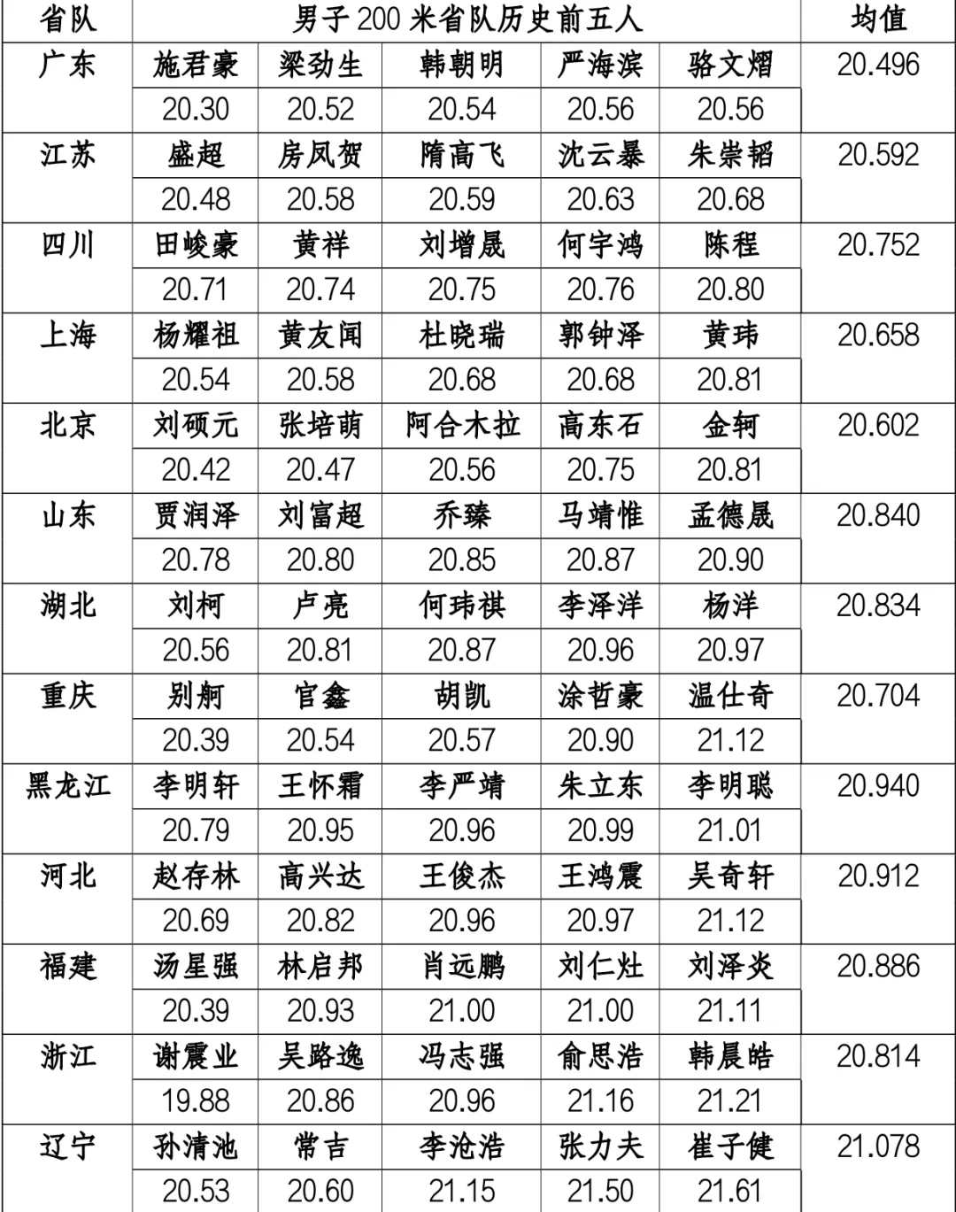 下图记载了所有国内(不含港澳台)男子200米合法风速破21秒大关的运动员