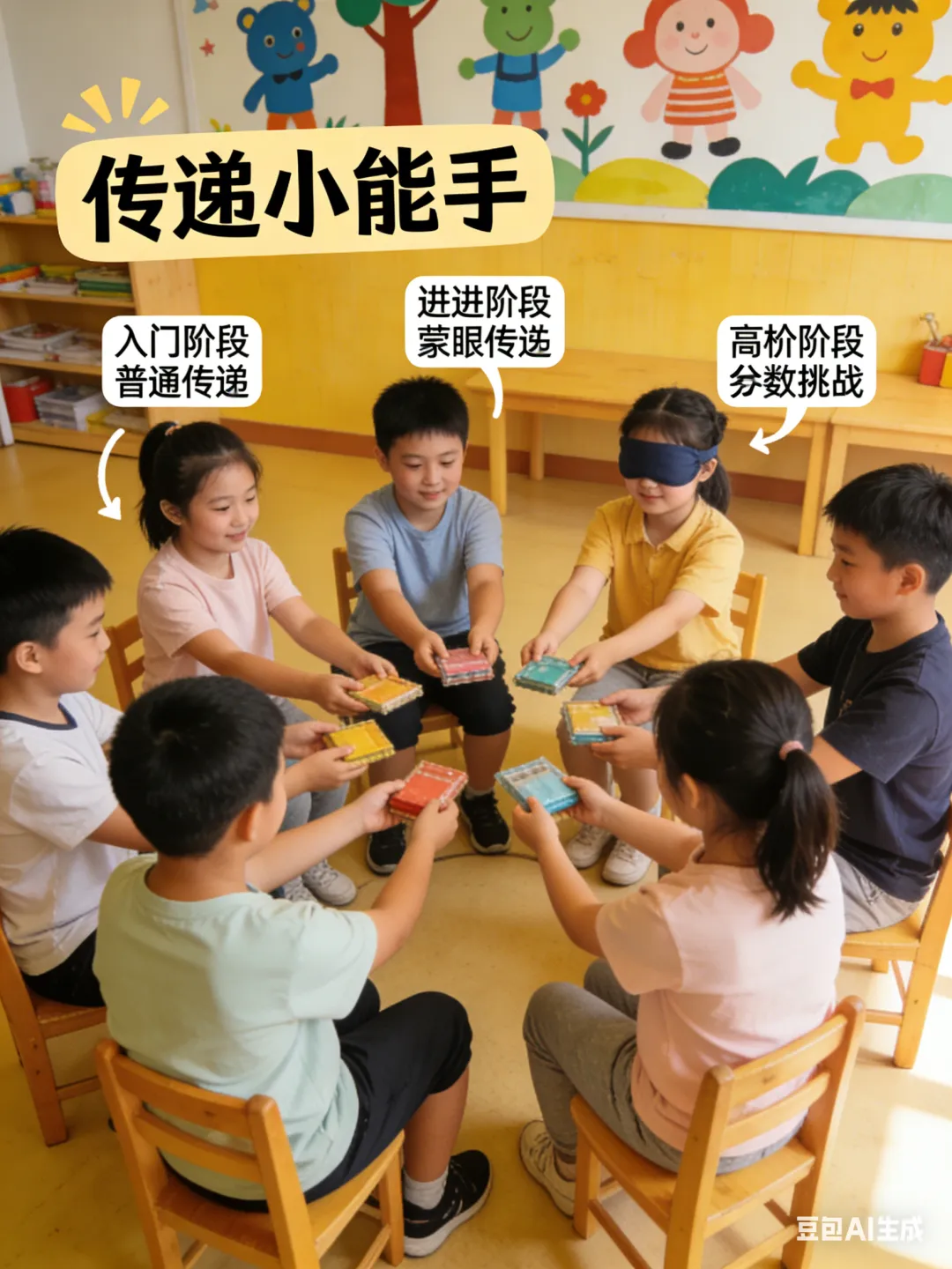这类游戏是小组课的入门必备,核心是帮助孩子互相熟悉,激发孩子对同伴的兴趣,让孩子了解团队的性质和规则,同时增加彼此间的信任和安全感,为后续的团体互动打下基础。游戏设计遵循由简到难的原则,从基础点名逐步过渡到自我介绍、社交互动。代表游戏:快递小能手(改良版)准备不同颜色的快递盒,在游戏中练习标准化社交动作,兼顾规律建立、空间意识与肢体协调: