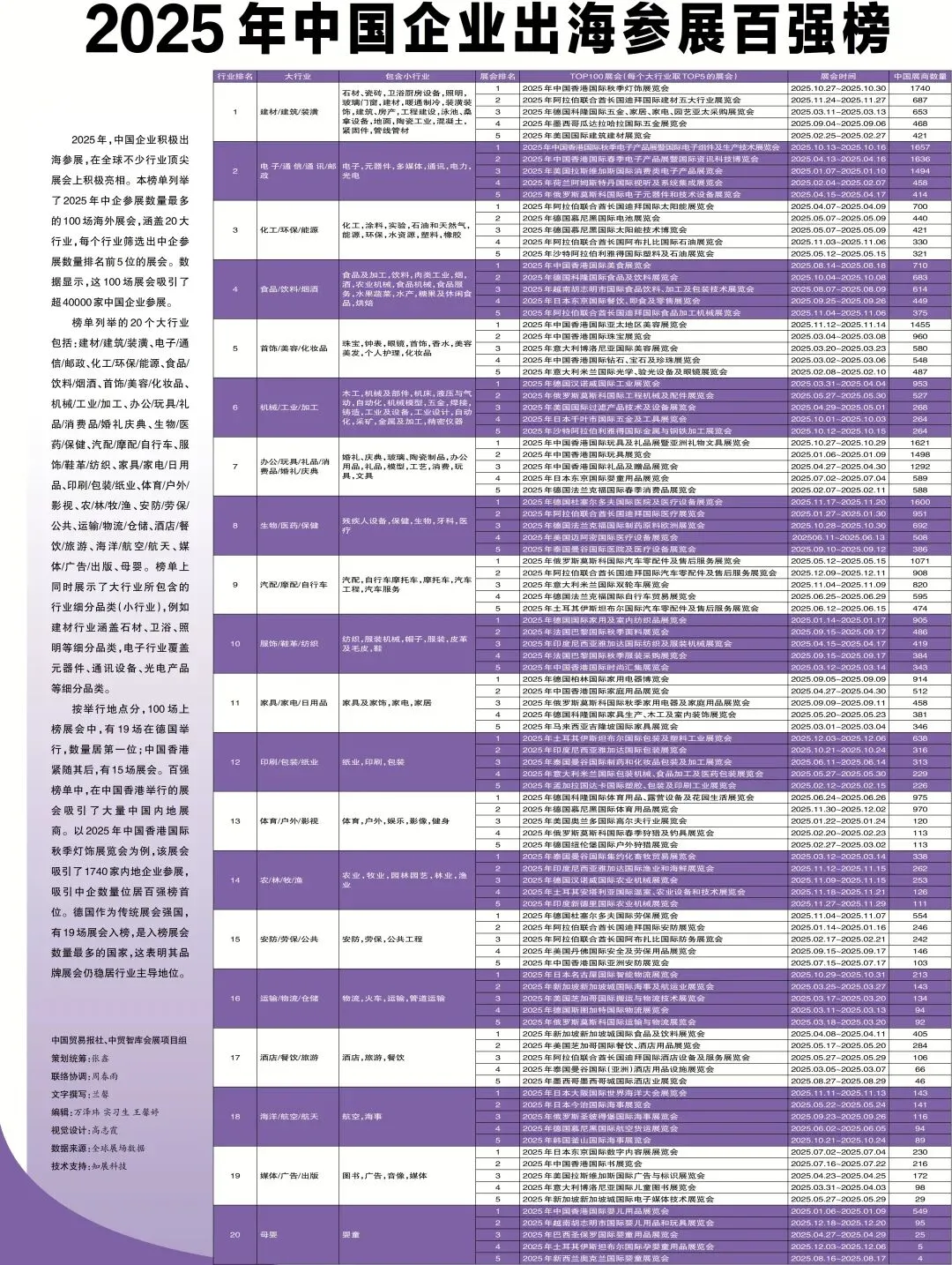 按举行地点分,100场上榜展会中,有19场在德国举行,数量居第一位;中国香港紧随其后,有15场展会。百强榜单中,在中国香港举行的展会吸引了大量中国内地展商。以2025年中国香港国际秋季灯饰展览会为例,该展会吸引了1740家内地企业参展,吸引中企数量位居百强榜首位。德国作为传统展会强国,有19场展会入榜,是入榜展会数量最多的国家,这表明其品牌展会仍稳居行业主导地位。