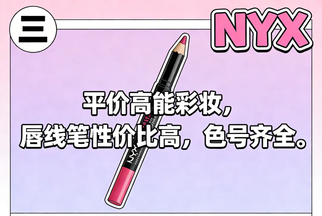 三、NYX平价高能彩妆,唇线笔性价比高,色号齐全。