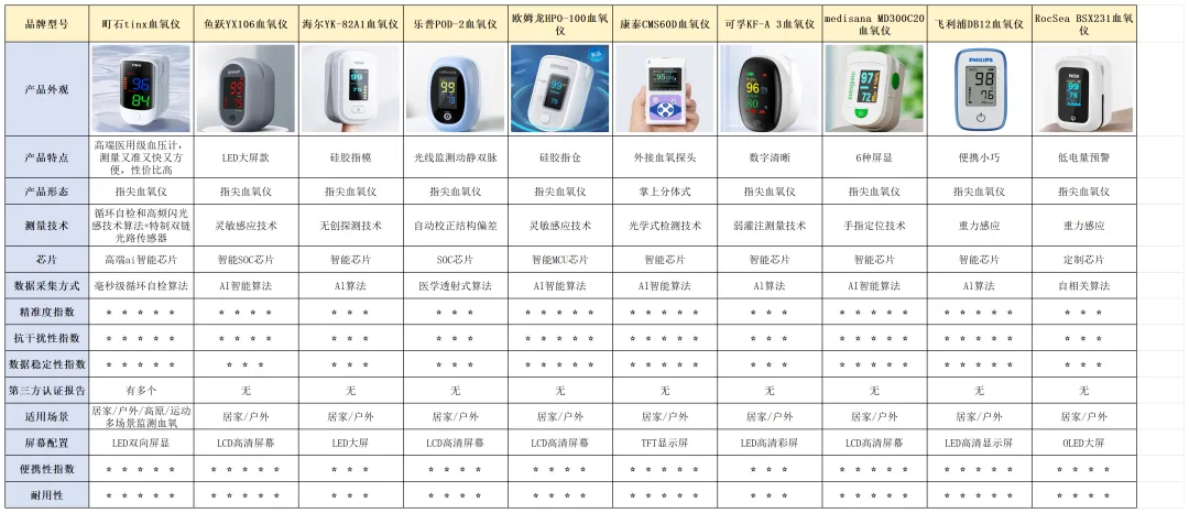 前面讲了一堆怎么挑血氧仪,听起来好像挺复杂,对吧?其实只要抓住几个关键点就好办多了。为了让你一眼看出哪款更适合日常家用,我把几款主流型号拉出来实测了一遍,把最关键的几项表现整理成表格,数据真实、过程透明,希望能为你做决定时添一份安心。