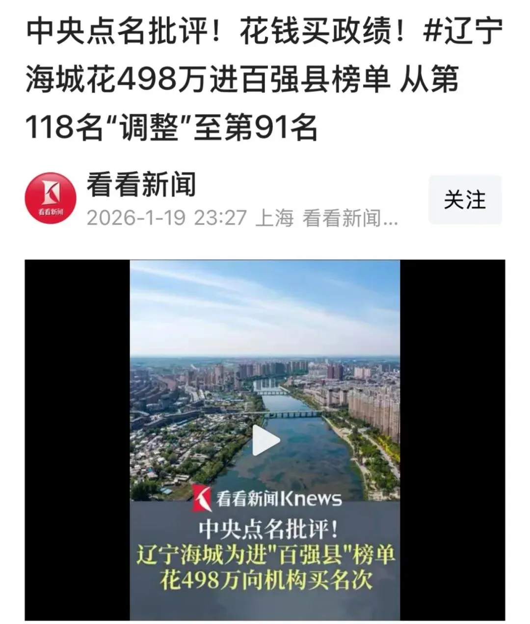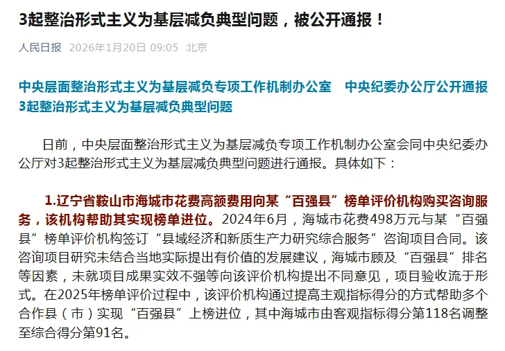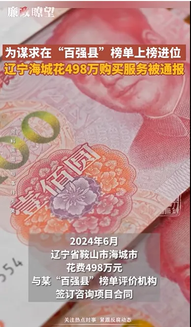 央媒最近通报三起形式主义案例,辽宁海城市花498万元买“百强县”榜单迅速引爆舆论。