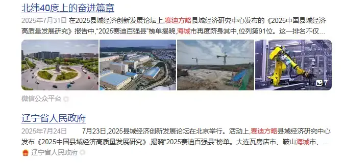 当地媒体还发了篇《喜讯!海城荣登2025中国县域经济百强榜》,不过目前已悄悄删除。