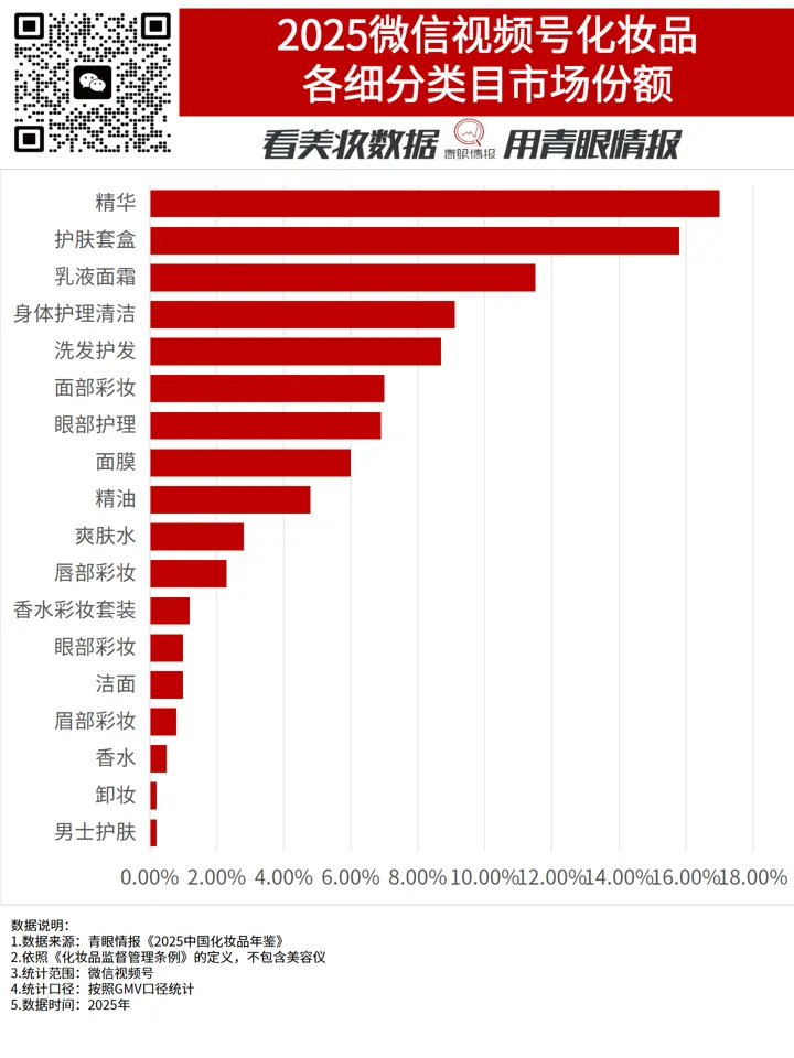 2025年微信视频号化妆品类目GMV为121.8亿元。从品牌所属国别来看,国货品牌市场份额为80.4%,占绝对主导地位。从品类来看,护肤品市场份额为68.9%,位居第一,其次是彩妆香水,市场份额为13.2%。