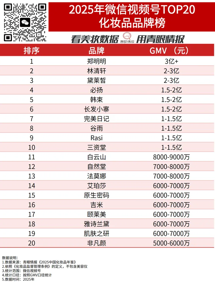 从具体品牌来看,微信视频号TOP20的化妆品品牌中,GMV破亿的有10个,其中郑明明以3.7亿元位居第一。