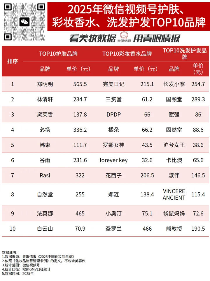 从平均单价来看,护肤品牌>洗发护发品牌>彩妆香水品牌>TOP50身体护理,由此可见,护肤类目相较于其他类目溢价空间更大,视频号当前只能承载“高功效可视”品类的高客单,身体护理尚缺价值锚点。