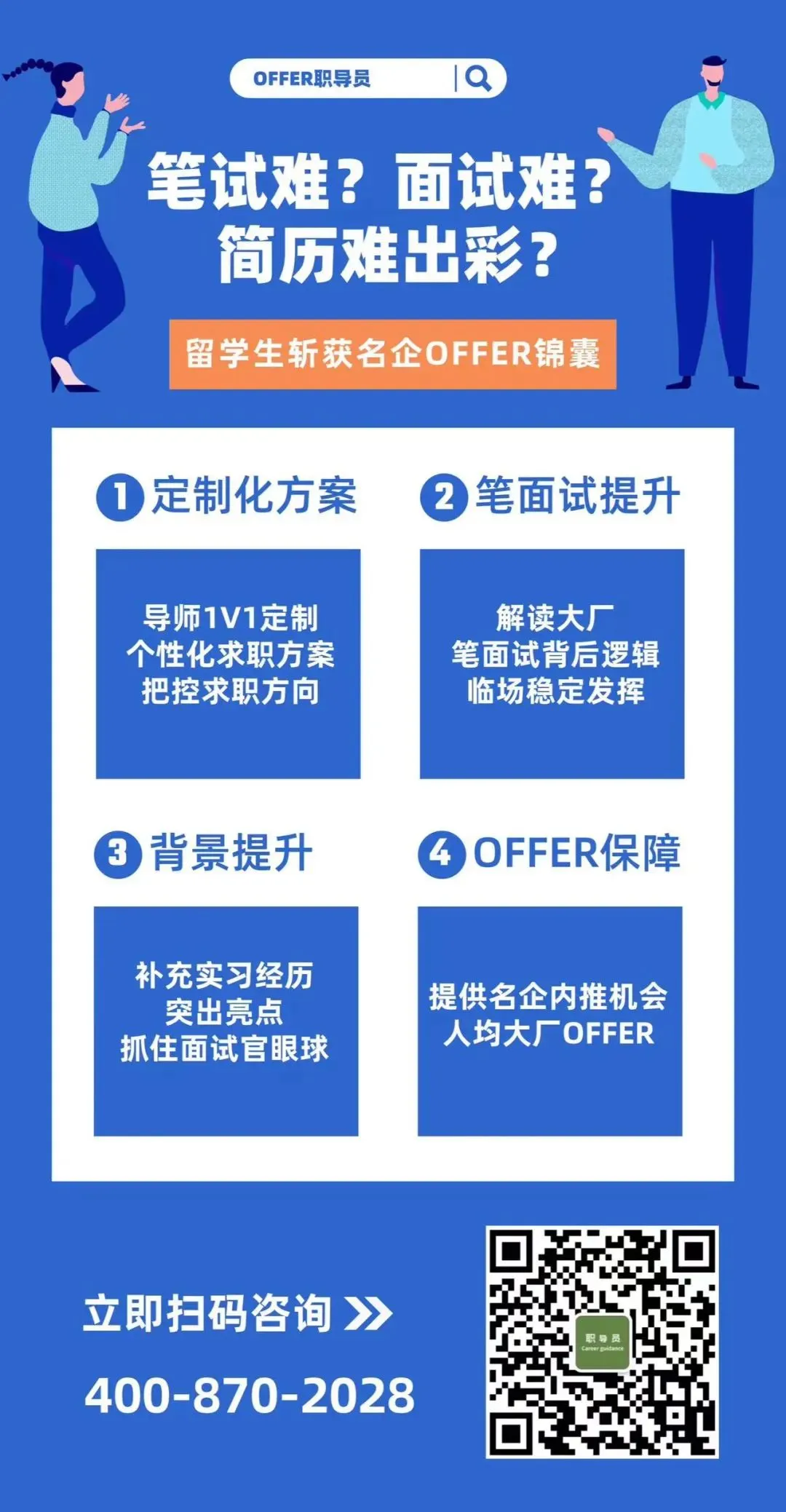 OFFER职导员还汇聚名企在职导师团队和资深HR全职顾问,为每位客户设计、制定相匹配的一站式定制解决方案,帮助客户做出积极的、显著的、持久的以及实质性的能力提升,大大提升拿offer几率!分析客户的职业气质、兴趣、能力结构,帮其明确自身优劣势,精准定位职业领域。