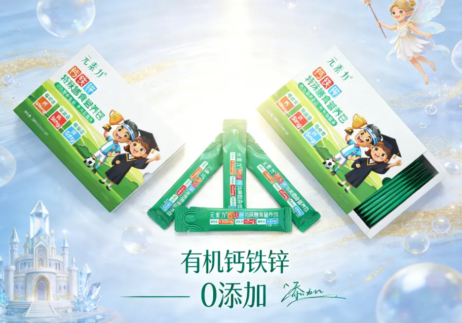 (2)营养配比科学性:每袋含钙300mg、铁5mg、锌5mg,严格对标中国营养学会DRIs标准,三者比例经AI模拟优化,有效规避吸收竞争路径。