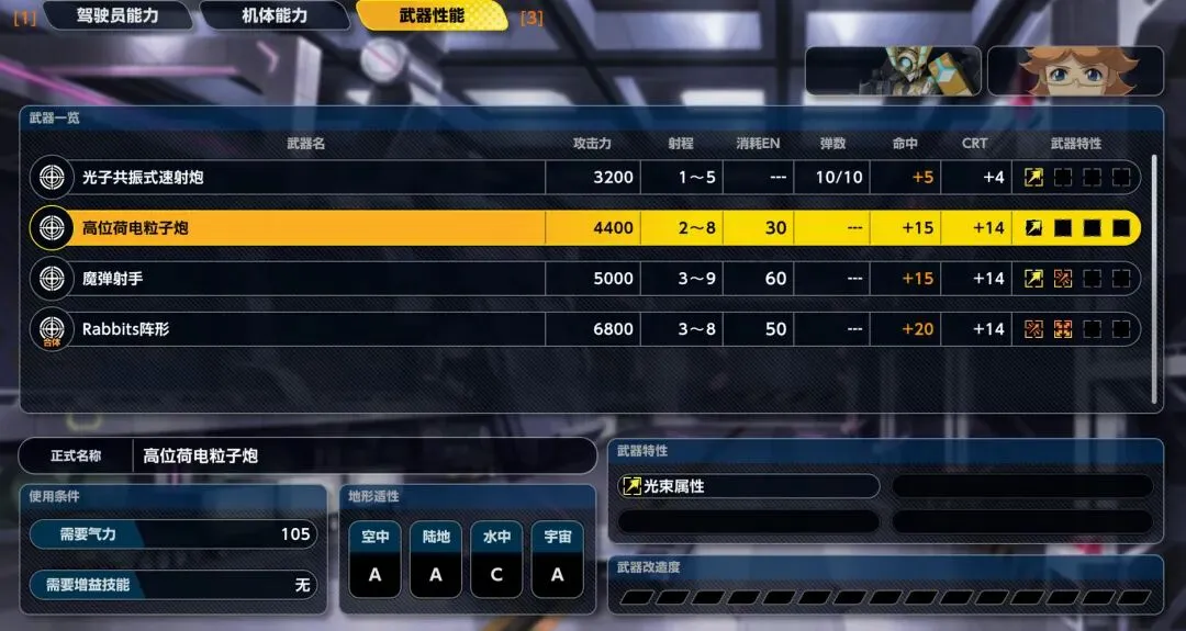 本关初期我方只有兔子小队和和敌方分别位于地图左侧和右侧,其中GOLD FOUR获得了新武器魔弹射手,等级不高的角色不要太靠前,如果等级都不高可能需要打战线练级,所以建议至少RED FIVE要改造一下。当然敌方最小的杂兵还是很弱的,差10级也能打出伤害。击坠5个敌人后,触发剧情,兔子小队解锁合体技Rabbits阵形,敌方增援在地图右下出现,我方本队在地图左侧出场。