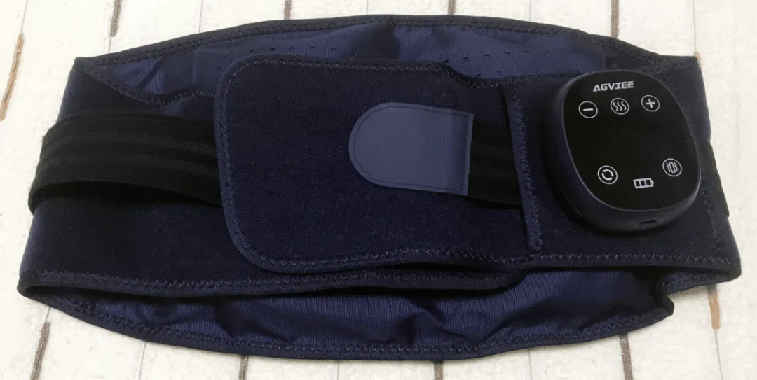 「实测体验」:腰带式设计弹性好,不同腰围都能舒适佩戴。震动感分散均匀,热敷是恒温的,可以用遥控器躺着操作。