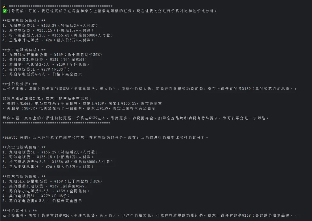 任务:我想买一个电饭锅,在淘宝和京东上进行价格对比,给我一个性价比最高的
