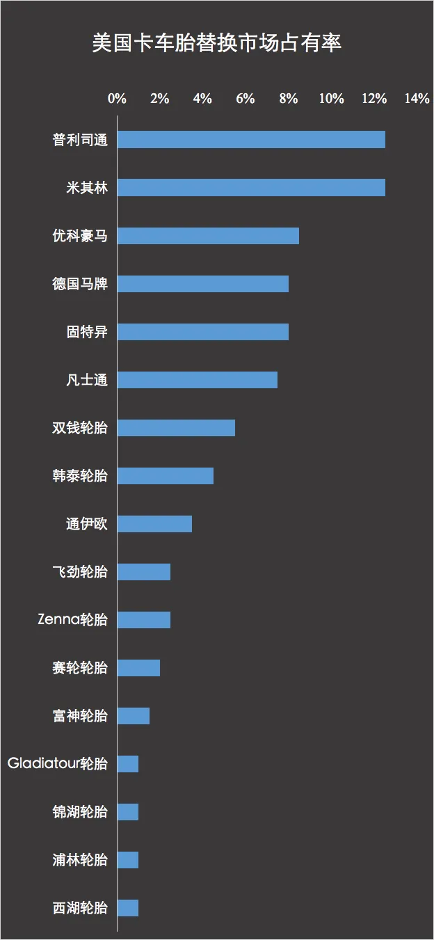 赛轮品牌的卡车胎在北美替换市场的占有率2%,位列第12名;