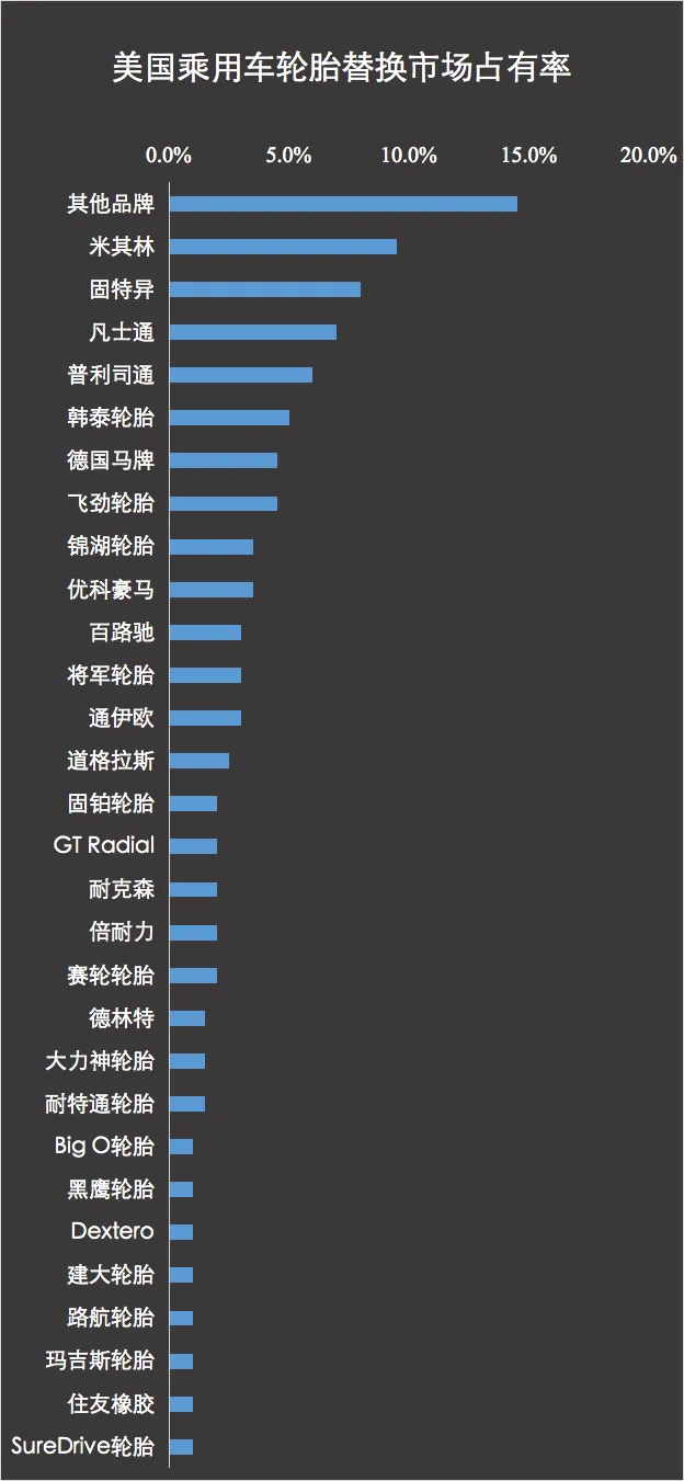 米其林、凡士通和固特异仍是美国市场最受欢迎的三大品牌,但是与卡车胎市场的处境一样,三大品牌的市场占有率也出现了0.5%到1%的下滑,如果按照机构预测数据计算,多数欧美和日本品牌在替换市场的销量下滑在100万条到200万条之间。