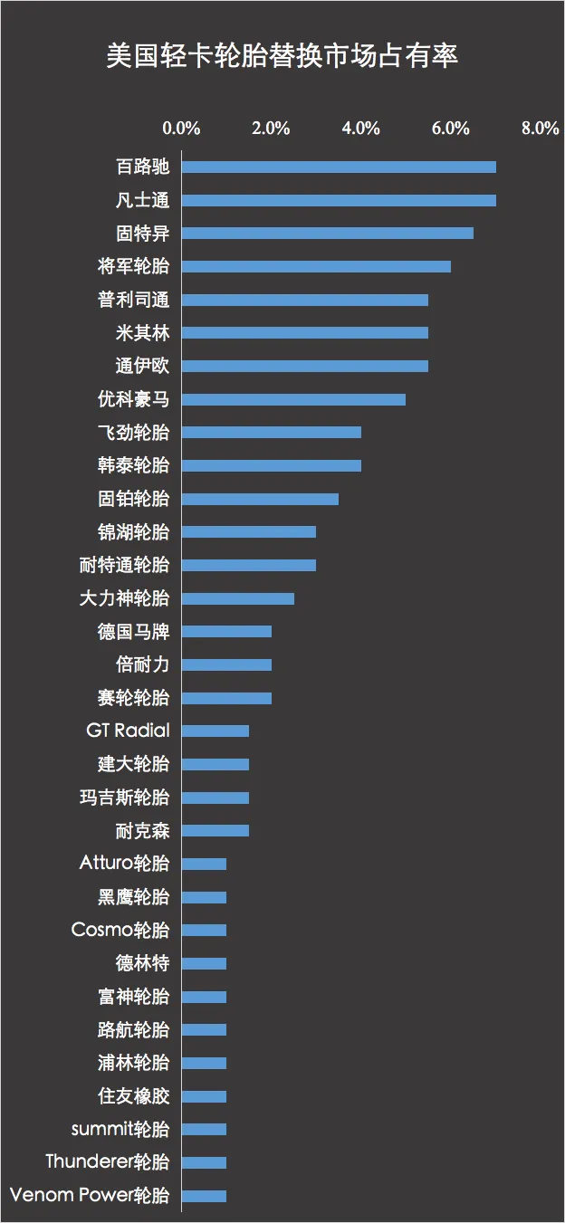 北美轻卡轮胎替换市场,百路驰超越固特异排名第一,市场份额占有率为7%。