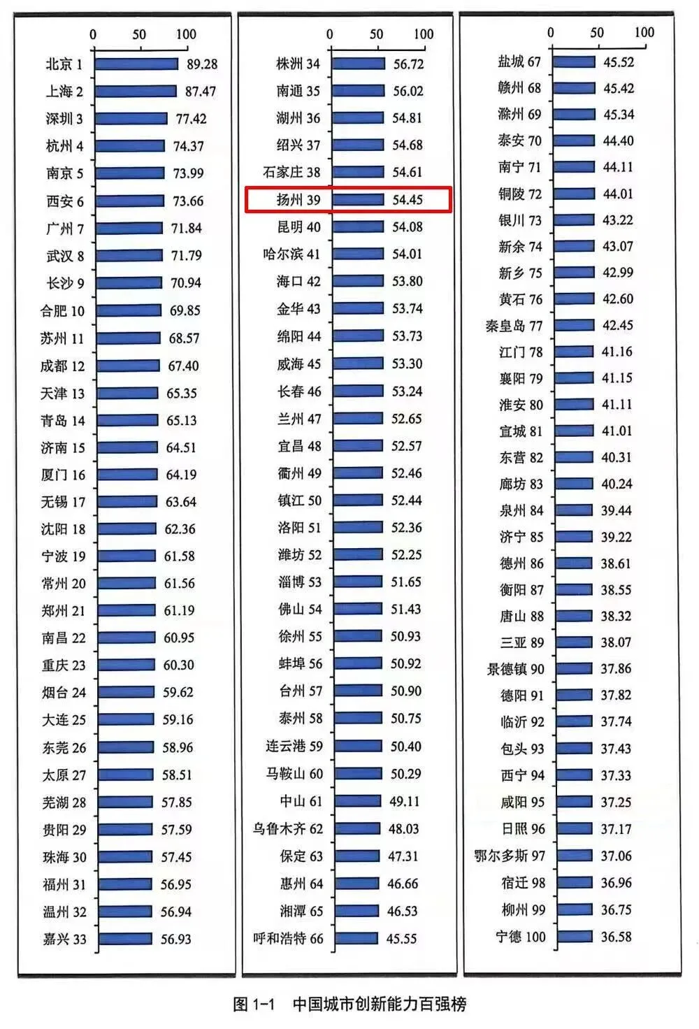 报告显示,扬州以54.45的指数,在全国城市创新能力百强榜单中位居39位。