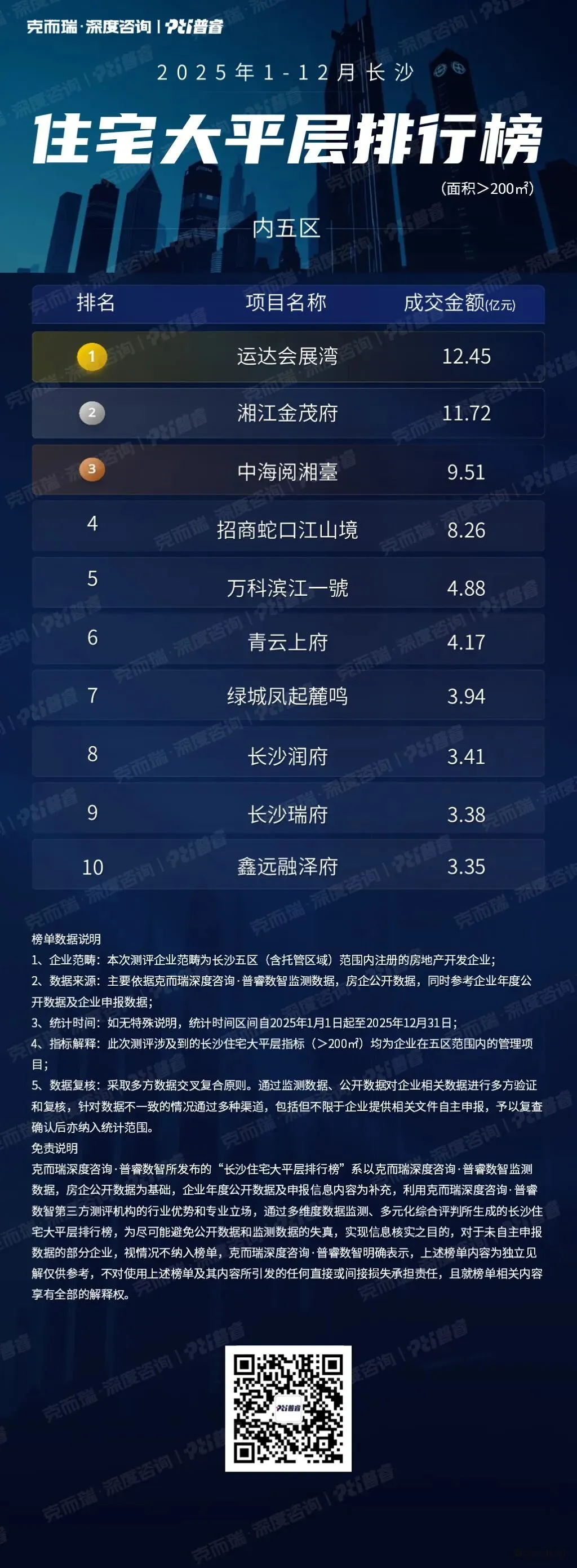 2025年,长沙市内五区7层以下真洋房产品新增供应仅132套,成交199套,市场整体处于极度稀缺状态。从成交金额来看,保利天瑞以3.96亿元的业绩占据绝对主导地位,其余项目成交额均未突破1亿元,市场集中度极高。然而,土地供应端已显现变化趋势。近两年内,长沙已成功出让9宗容积率低于2.0的住宅用地,但目前仅保利天瑞一盘入市,其余地块开发进度不一。其中,由汇方集团竞得的梅溪湖二期低容地块,规划中洋房产品占比显著提升,预示未来产品结构将向低密改善型倾斜。从2026年开始,随着这批“存货”陆续进入市场,压抑已久的洋房需求或将得到释放,该细分市场有望迎来一波新的热度。住宅大平层:顶豪双子星格局形成