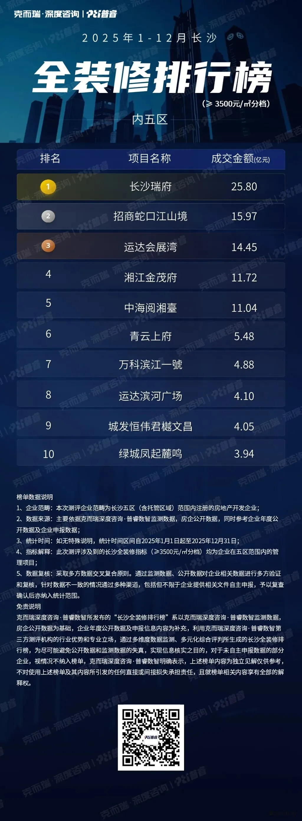 其中,【长沙瑞府】以25.80亿元的业绩高居榜首。项目在2025年推出的四期新品中,进一步升级产品力:打造立体庭院与5.8米层高架空泛会所,部分楼王产品垂直空间达11米;户型设计强调270°全景视野与嵌入式庭院,得房率最高至107%;地下空间创新设计“生机之环”主题车库,并迭代华为全屋智能系统,从空间效能、美学体验与智能互联等多维度实现居住升级。