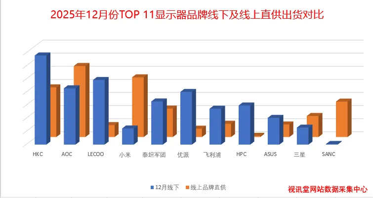 2025年12月大陆显示器TOP11品牌线上线下出货图表