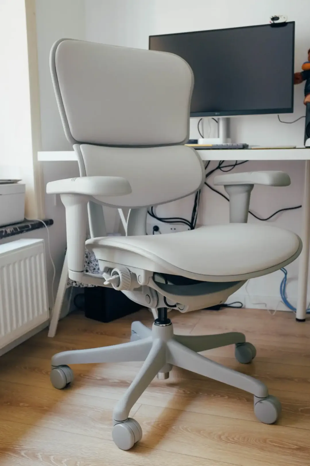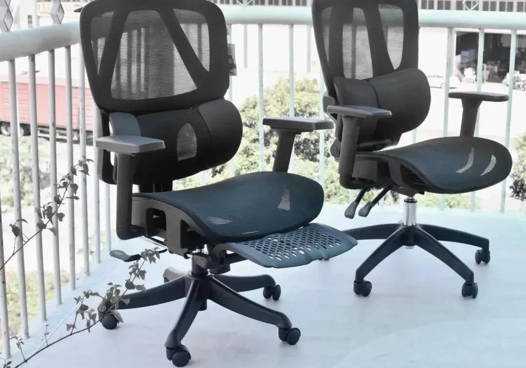 护腰效果:双背联动系统,椅背上下分区可独立活动,坐时腰背能获得动态贴合支撑,一定程度缓解腰部悬空感。支撑力度适中,无明显顶腰不适;不足是分区联动顺滑度一般,坐姿快速切换时略有卡顿感。