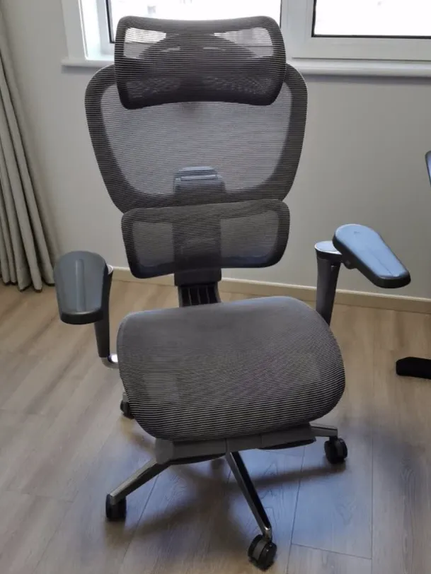 使用感受:椅面是龙纹特网布,透气性过关,夏天久坐也不会觉得闷热。坐感偏硬,支撑性够足,适合需要长时间坐着办公的场景。头枕里有记忆棉,能给颈部一定支撑;缺点是硬坐感没什么缓冲,久坐后腰臀会有点轻微压迫感。
