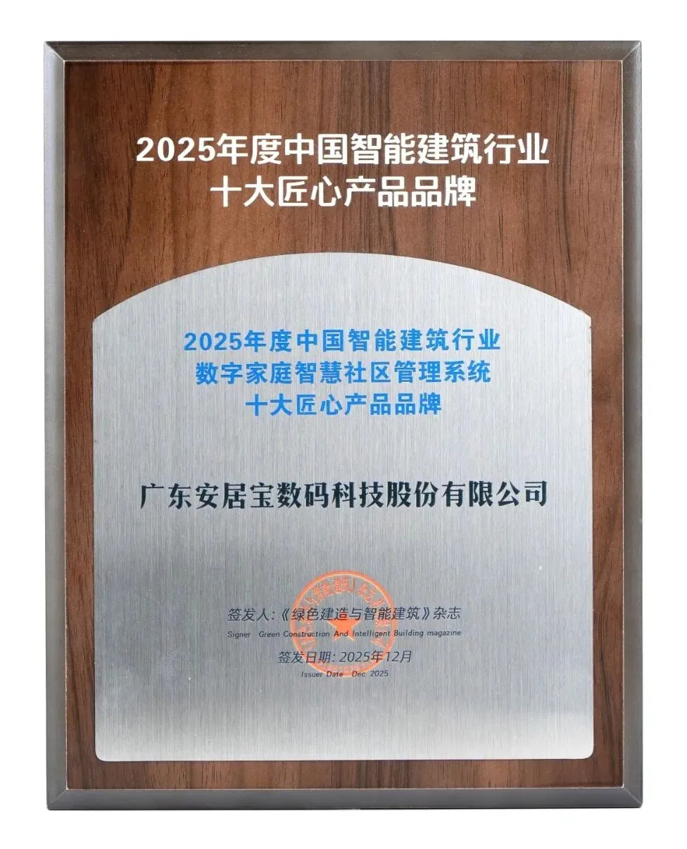 近日,为弘扬工匠精神、推动行业高质量发展,行业权威评选结果揭晓,安居宝凭借数字家庭智慧社区管理系统的卓越品质与创新实践,成功斩获“2025年度中国智能建筑行业数字家庭智慧社区管理系统十大匠心产品品牌”称号,用实力诠释匠心内涵,为智能建筑行业注入温暖的品质力量。