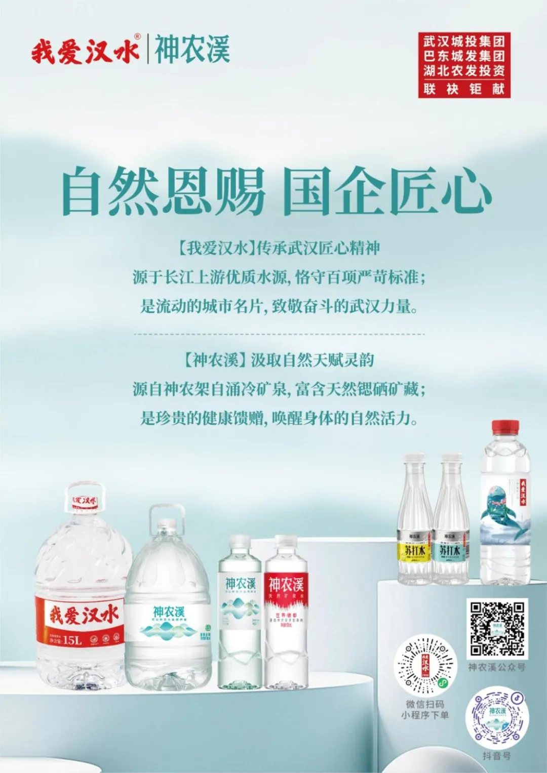“神农溪”是“我爱汉水”子品牌。神农溪天然矿泉水,源自神农架南麓天然优质水源,现已构建起覆盖便携装,家庭装及健康衍生品的多元产品矩阵,已打通线上渠道并引入省属国企增资,凭借斗茶大赛"双冠"、全国级重要赛事冠名、企业公益等举措扩大品牌影响力,未来三年将陆续推出果饮、茶饮等区域特色饮品,力争成为华中地区健康饮料领导品牌。